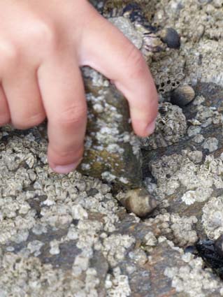 Ensuite, un déplacement sur le platier faisant face au gisement, et découvert par la marée basse, a permis de montrer les pourpres au sein de leur environnement et de tenter des fragmentations de coquilles pour des expérimentations de teintures de mouchoirs assez réussies. On notera l’habileté de la très jeune fille de Frédéric Brettier dans la fragmentation des coquilles, ce qui ne put manquer de soulever la question du possible travail des enfants dans ce type d’exploitation !