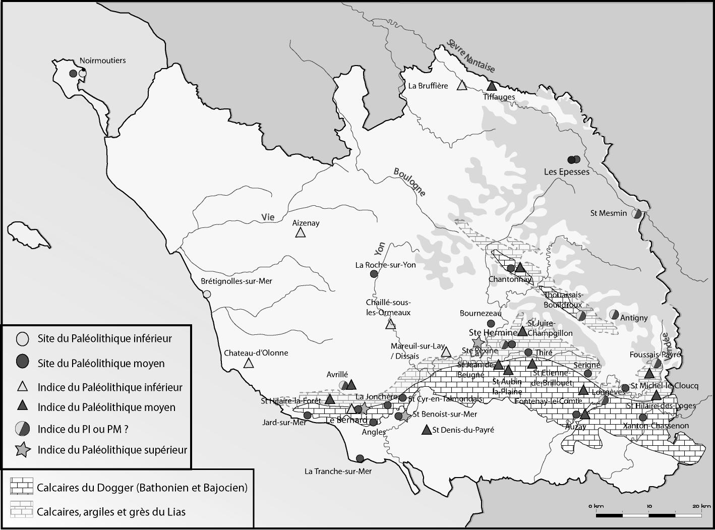 Si l’on s’attelle à dresser un bilan de la connaissance des vestiges du Paléolithique vendéen (sites et indices de sites connus) d’après les données fournies par la littérature et les collections du Musée Départemental de Vendée, on peut dresser une nouvelle carte de répartition des sites paléolithiques, qui correspond à l’état de la recherche.